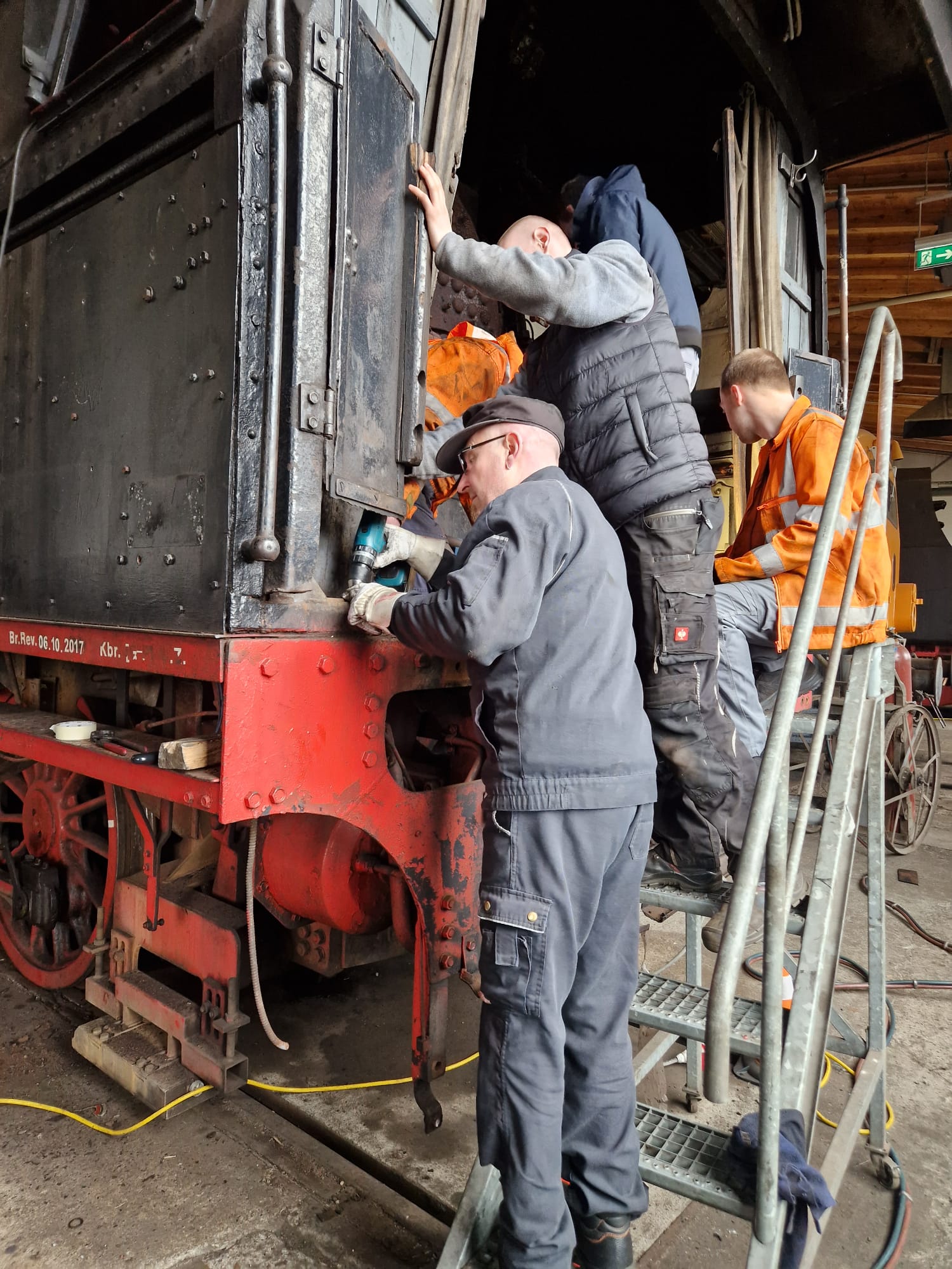 Auch war unsere Dampflok Emma aus dem Winterschlaf zu erwecken. Hier mussten diverse Ventile und Luken am und im Kessel wieder verschlossen werden, die wir im Herbst demontiert hatten, damit keine Frostschäden über Winter entstanden. Außerdem haben wir den Kessel gleich mit Wasser gefüllt und Holz für das erste Anheizen geladen.