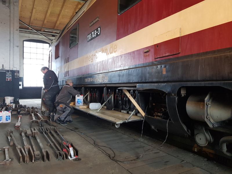 Einige Wartungsarbeiten erfährt auch eine der großen Dieselloks. Die Starterbatterien der 118 748 brauchten mal wieder frisches, destilliertes Wasser. Nachdem sie heute wieder eingebaut wurden, wurde das Batterieladegerät angeschlossen. Vielleicht können wir die Lok zur nächsten Veranstaltung ja mal ... ?!