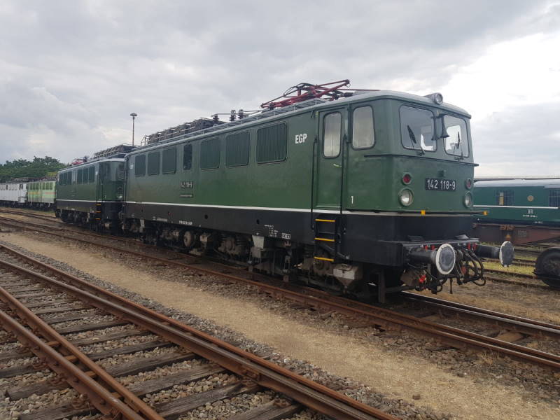 Draußen konnten viele Fahrzeuge bestaunt werden. So hatte die Eisenbahngesellschaft Potsdam beispielsweise zwei Elektrolokomotiven der Baureihe 142 für die Ausstellung bereitgestellt.