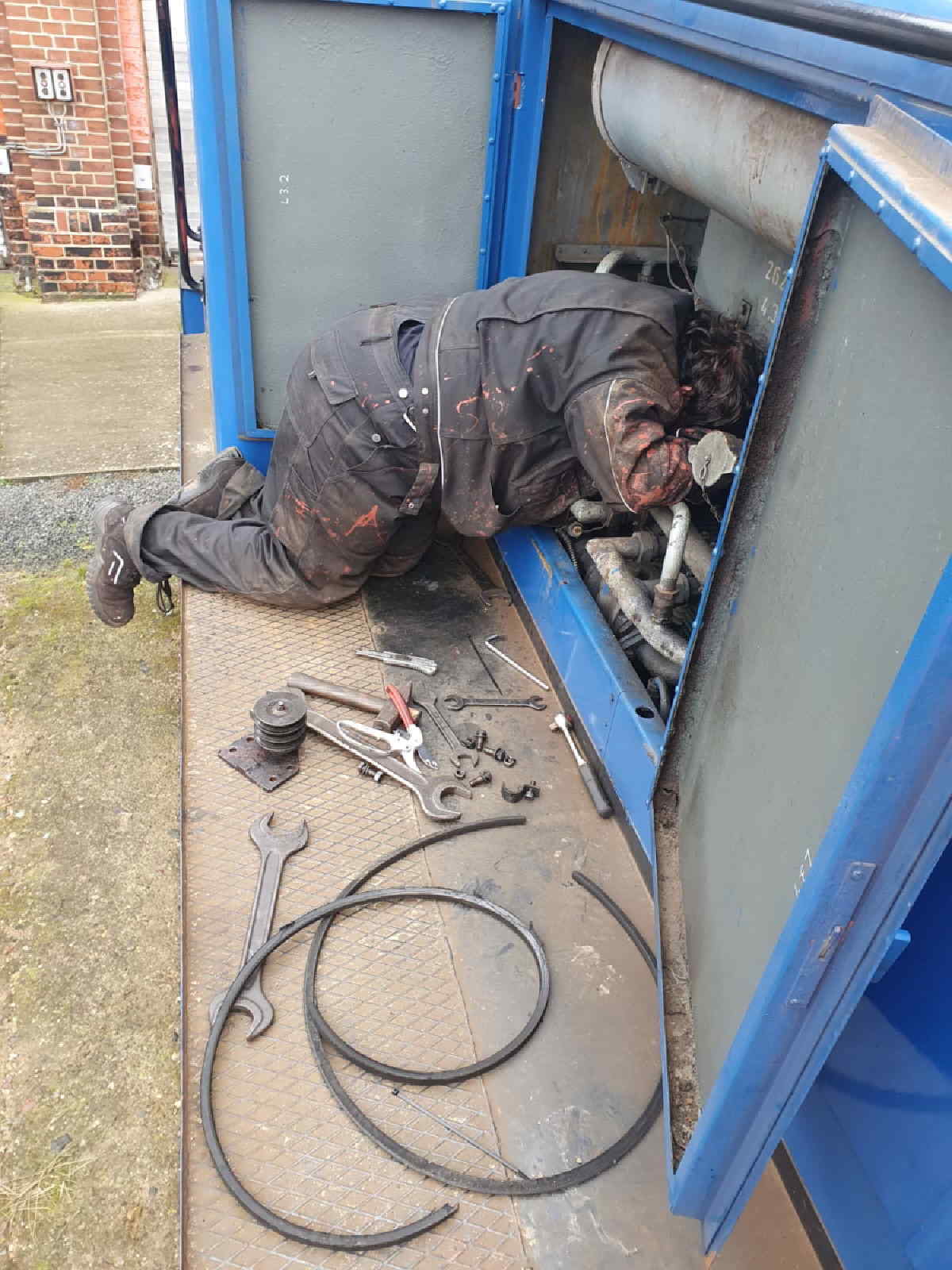 Auch eine unserer Dieselloks der Baureihe V22 brauchte etwas Zuwendung. Hier mussten neuen Keilriemen zwischen Getriebe und Kompressor eingebaut werden, weil die alten stark abgenutzt waren.