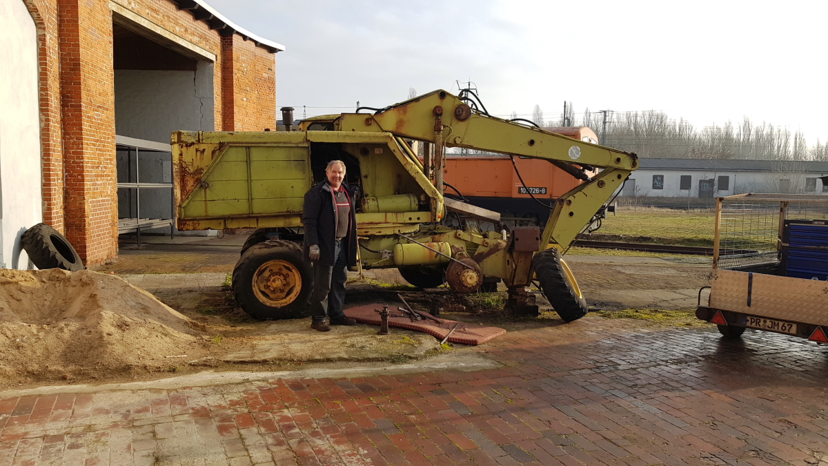 Auch das nächste Fahrzeugprojekt zeichnet sich schon ab. Da unser bisheriger Bagger vor einiger Zeit einen Getriebeschaden erlitten hatte, haben wir uns dazu entschieden, den Reservebagger der Baureihe Fortschritt T174/II wieder zum Leben zu bringen. Am vergangenen Wochenende haben wir ihn schleppfähig gemacht, damit er in Kürze in unsere Werkstatthalle geschoben werden kann