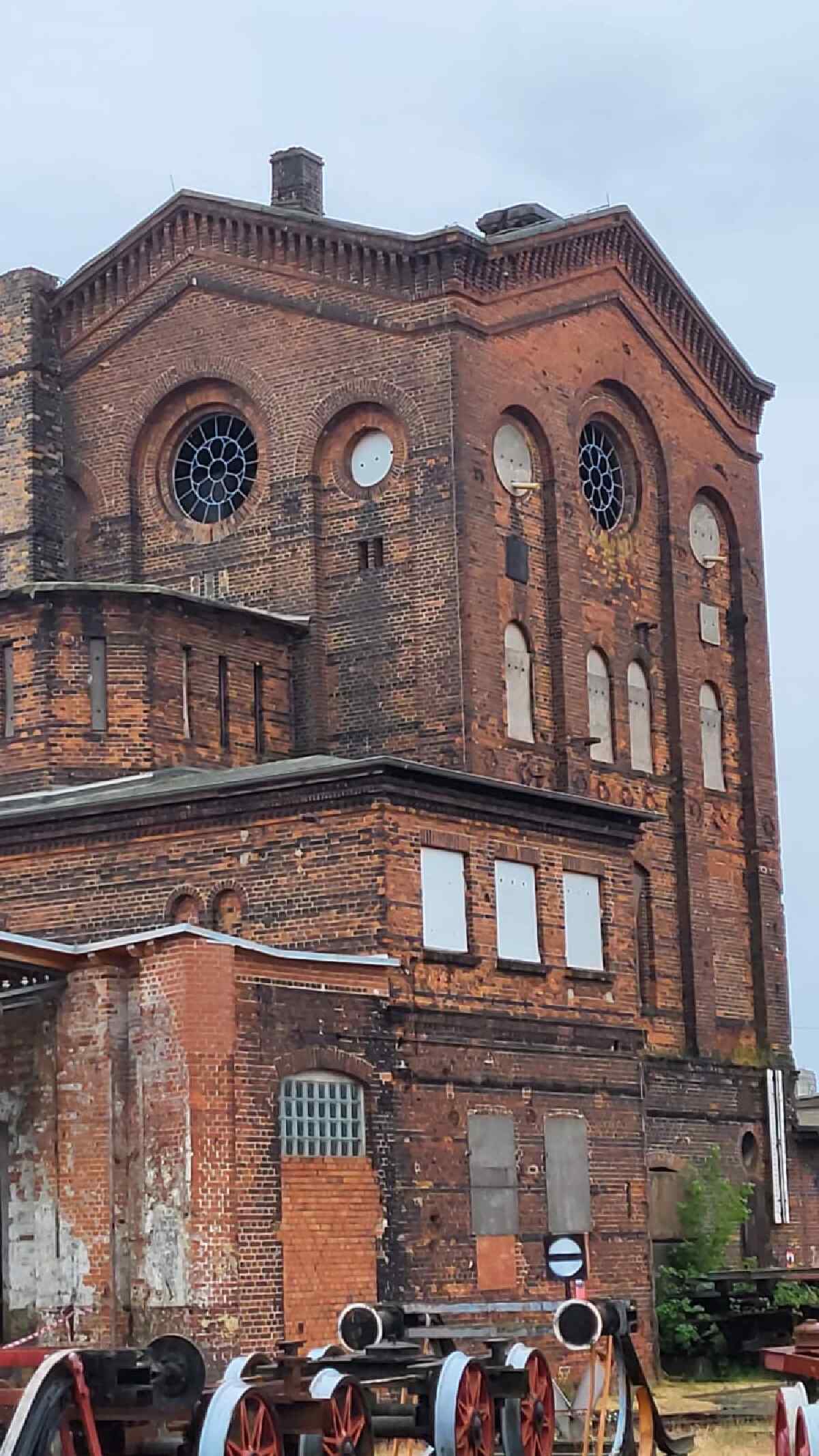 In der ehemaligen Wasserstation, dem rechteckigen Wasserturm, wurden etliche Fenster freigelegt und mit neuen Holzplatten verkleidet, bevor sie wieder neues Glas erhalten können. Das wird zwar noch etwas dauern, aber die Rosetten der Fensterrahmen lassen den kathedralen Charakter des Gebäudes bereits jetzt erahnen.