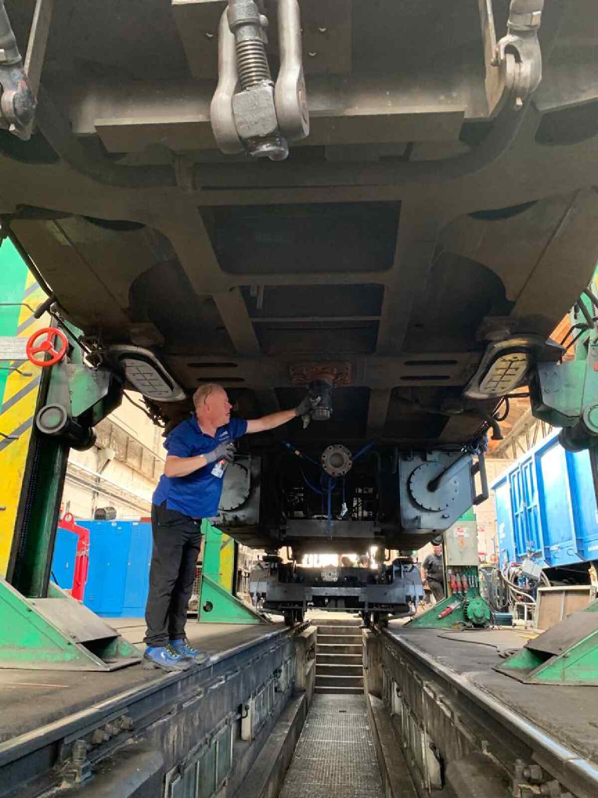 Anschließend wurden die Drehzapfen gereinigt und mittels Ultraschall auf Risse untersucht. Sie befinden sich unter dem Lokkasten und bilden die zentrale Verbindung zu den Drehgestellen. Zum Glück stellte sich heraus, dass beide Drehzapfen in tadellosem Zustand sind.