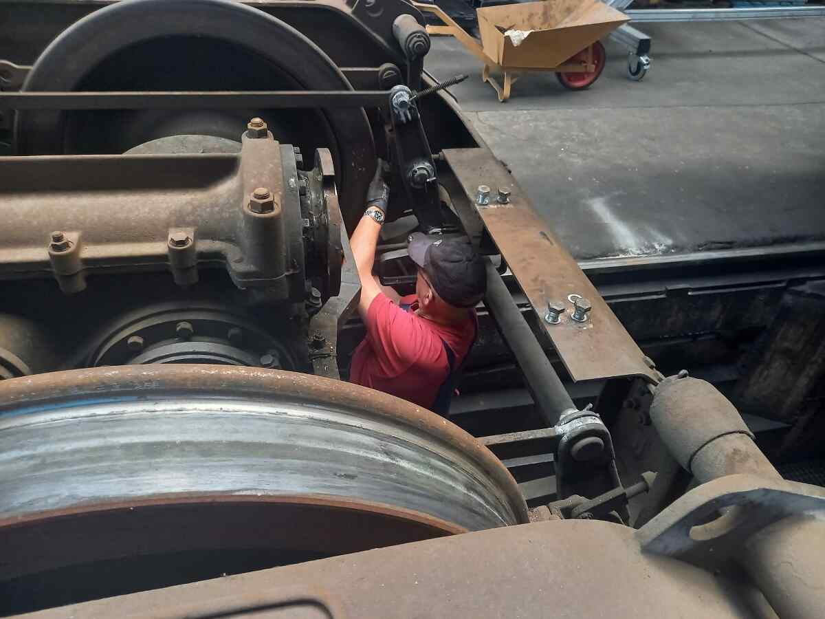 Außerdem wurden die Drehgestelle begutachtet und gereinigt. Eine weitere Tagesaufgabe bestand letztlich darin, die alten Bremsbeläge auszubauen und die Bremsanlage für den Einbau neuer Bremsbeläge vorzubereiten.