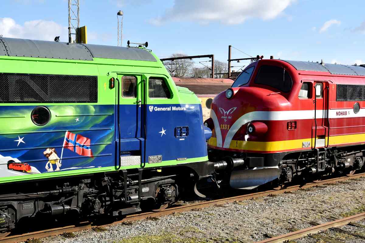 Genauer gesagt geht es die formschönen Lokomotiven der Firma Nydqvist och Holm AB (abgekürzt NOHAB), die Ende der 1940er Jahre Lizenzen bei der amerikanischen Firma General Motors zum Bau von Lokomotiven erworben hatte.