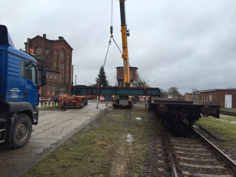 Wer die Verhältnisse im alten Bw Wittenberge kennt, weiß, dass es ehemals zwei Drehscheiben und noch einen weiteren Lokschuppen gab. Der Schuppen war als sogenannte Rotunde ausgebildet, also ehemals ein vollkommen geschlossenes Gebäude mit innen liegender Drehscheibe. Leider wurde das ganze bzw. die Reste davon Ende des letzten Jahrtausends abgerissen bzw. verschrottet. Nun, da man ja nie genug Platz in einem Museum haben kann, entstand vor einiger Zeit der Plan, doch mittelfristig an einen Wiederaufbau der Drehscheibe, Gleise und später Teilen des Gebäudes zu denken. Und manchmal geht es schneller als man denkt: So konnten wir kurzfristig die 20-Meter-Drehscheibe des ehemaligen Bahnbetriebswerkes Parchim erwerben, die noch relativ jung ist. Diese wurde in den letzten beiden Tagen demontiert und die Einzelteile nach Wittenberge verfrachtet. Als nächstes werden wir die Teile aufarbeiten, dann eine neue Grube erstellen. Unser Dank gilt allen Beteiligten für die schnelle und unkomplizierte Abwicklung. Die Fotos stammen von Dirk Endisch und entstanden am 12. und 13.1.2016.