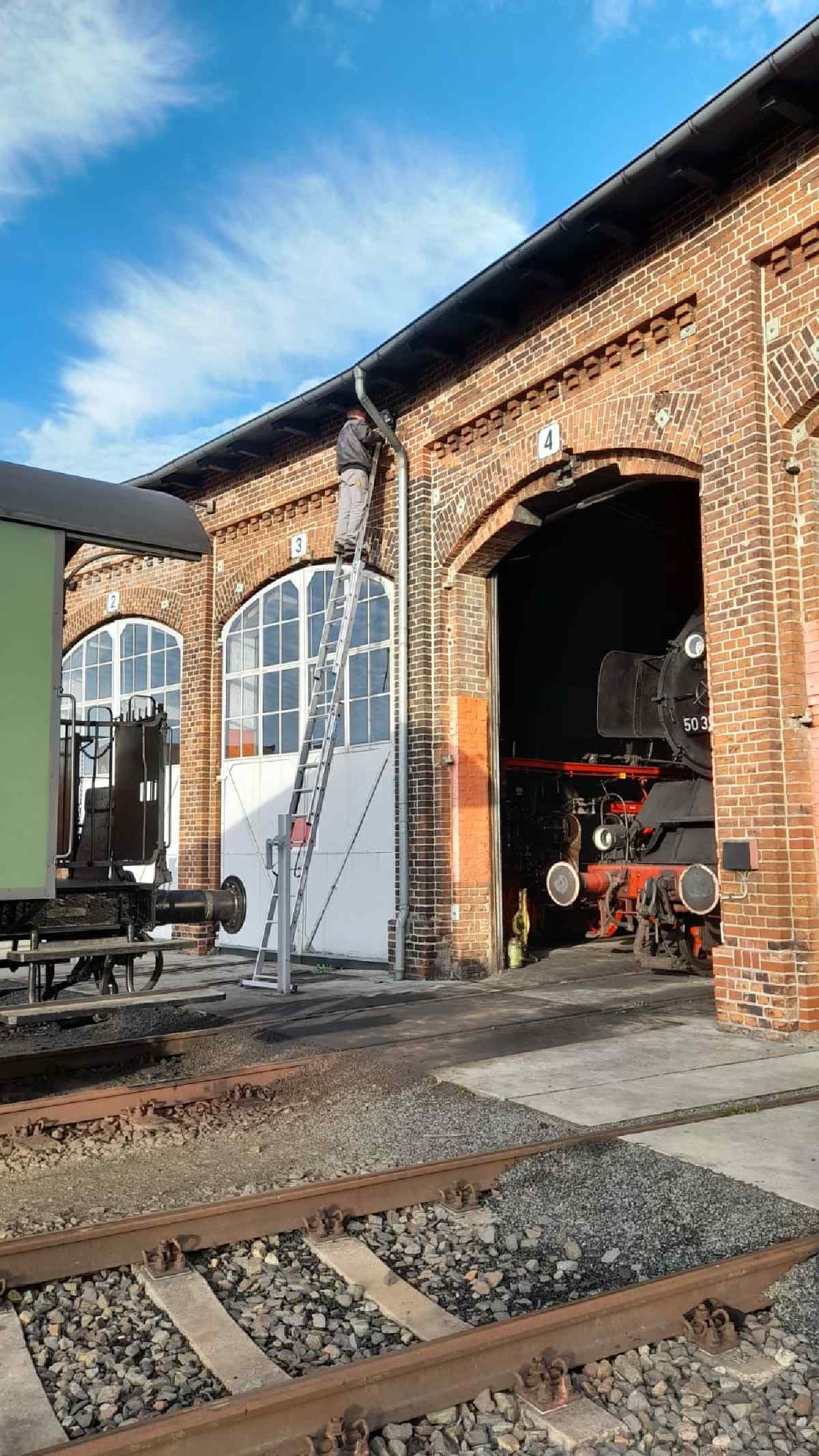 Was geschah an diesem Wochenende sonst noch? Nach Abschluss der Saison müssen unsere betriebsfähigen Fahrzeuge in den Winterschlaf versetzt werden. Am Samstag wurde deshalb der Kessel der 50 3570 ausgewaschen. Das bedeutet, dass die Rückstände, die beim Verdampfen des Wassers im Kessel zurückgeblieben sind, mit einem scharfen Wasserstrahl herausgewaschen werden.