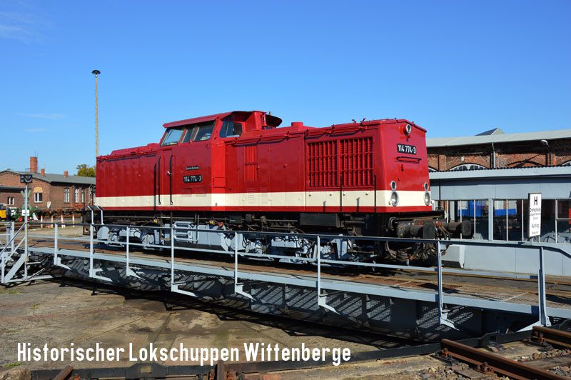 ![]() 114 774-3 posiert für die Eisenbahnfreunde am 10. Oktober 2015 auf unserer Drehscheibe. |