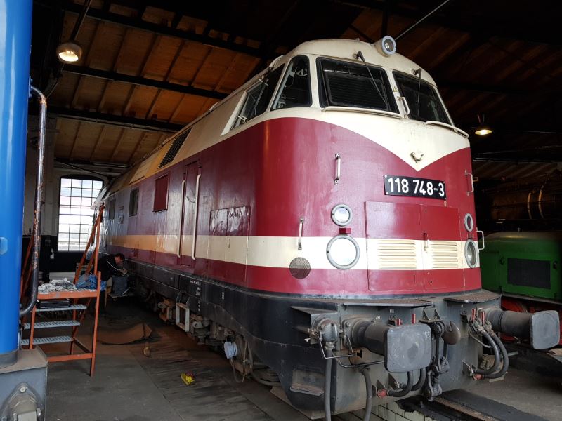 Einige Wartungsarbeiten erfährt auch eine der großen Dieselloks. Die Starterbatterien der 118 748 brauchten mal wieder frisches, destilliertes Wasser. Nachdem sie heute wieder eingebaut wurden, wurde das Batterieladegerät angeschlossen. Vielleicht können wir die Lok zur nächsten Veranstaltung ja mal ... ?!