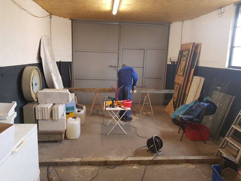 Auch in unserem Lokschuppenanbau ging es weiter, der als Lager genutzt wird. Hier wurde zunächst die Decke gedämmt, um zukünftig die bisher extremen Temperaturschwankungen zwischen Winter und Sommer in dem Raum abzumindern. Danach wurde eine Trennwand eingebaut, um den großen Raum zu teilen.