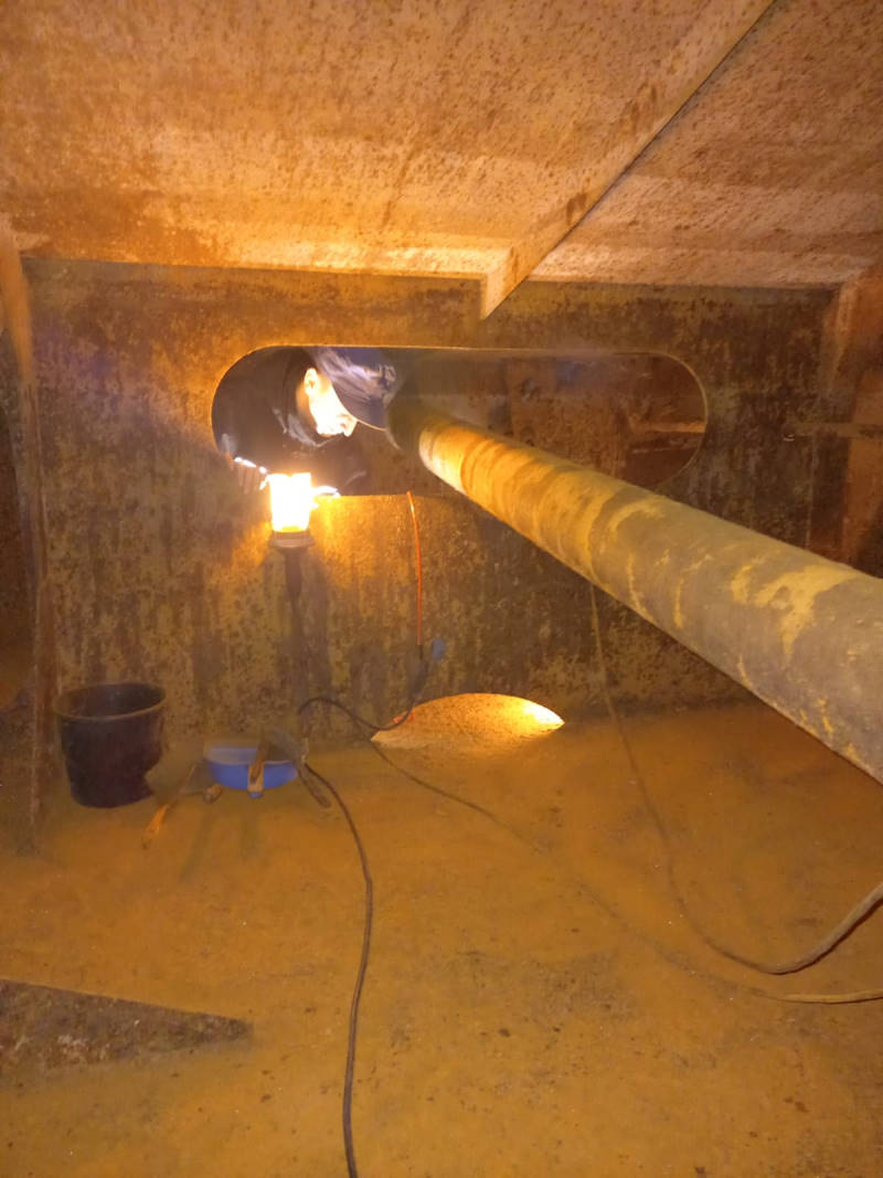Auch am Tender für die Dampflok 50 3570 ging der unerbittliche Kampf gegen den Rost und Kalkablagerungen weiter. Heute wurde die Innenseite des Tenders von grobem Kalk befreit und die Verschlüsse der Ablaufventile gangbar gemacht. Mit ihnen kann der Wasserzulauf vom Wasserkasten des Tenders zur Lok unterbrochen werden, wenn es eine Störung an den Pumpen der Lok oder Wartungsarbeiten gibt. Die Arbeiten sind ziemlich mühsam, weil sich die Kollegen vom hintersten Ende des Tenders bis zur anderen Seite, die zur Lok zeigt, vorarbeiten müssen. Dabei mussten sie sich durch einige Aussparungen in den sogenannten Schwallblechen zwängen. Die Schwallbleche verhindern, dass das Wasser während der Fahrt ungebremst durch Tender schwappt. Die Arbeiten sind sehr unangenehm, da der Platz sehr begrenzt ist, es dunkel ist und die Geräusche stark hallen. Keine Arbeit für Menschen mit Platzangst.