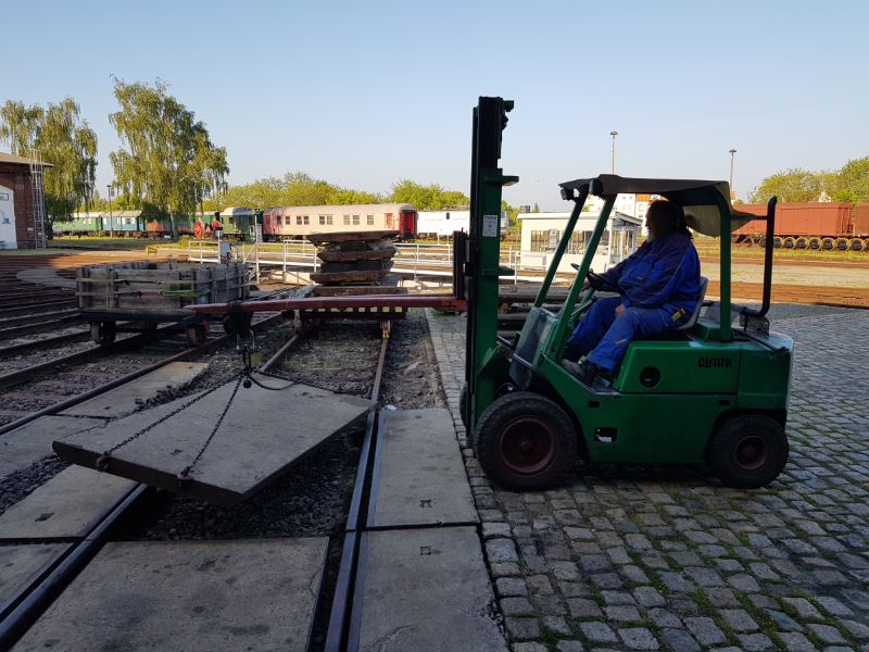 Weiter geht es mit dem Aufräumen des Lagers. Hier haben wir inzwischen viele Teile aussortiert, die wir mutmaßlich in nächster Zeit nicht brauchen werden. Diese haben wir in einem Güterwagen eingelagert. Der freie Platz im Lagerraum wird nun durch die Draisinen belegt, die vorher ausgegleist im Schuppen standen.