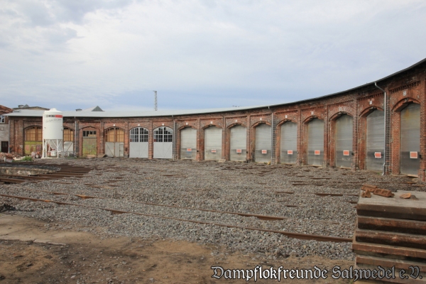 In den vergangenen Wochen wurde die Arbeiten in Wittenberge so gut wie abgeschlossen. Zuletzt wurde noch die Schuppentore instand gesetzt und deren elektrische Steuerung komplett erneuert. Die Strahlengleise in den Lokschuppen sowie die Zufahrts- und einige Abstellgleise wurden komplett erneuert. Jetzt erstrahlt der Lokschuppen und die wichtigsten Nebengebäude in neuem Glanz.
