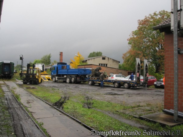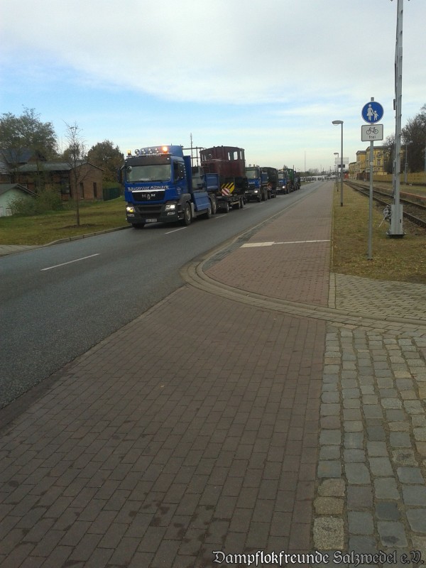 Aber die Geschichte geht weiter: Am 3.11.2012 wurden Kleinloks und Rangiergeräte per Tieflader nach Wittenberge gebracht. Der Konvoi bestehend aus fünf Tiefladern und zwei Autokränen sorgte auf der gesamten Strecke für erstaunte Gesichter.