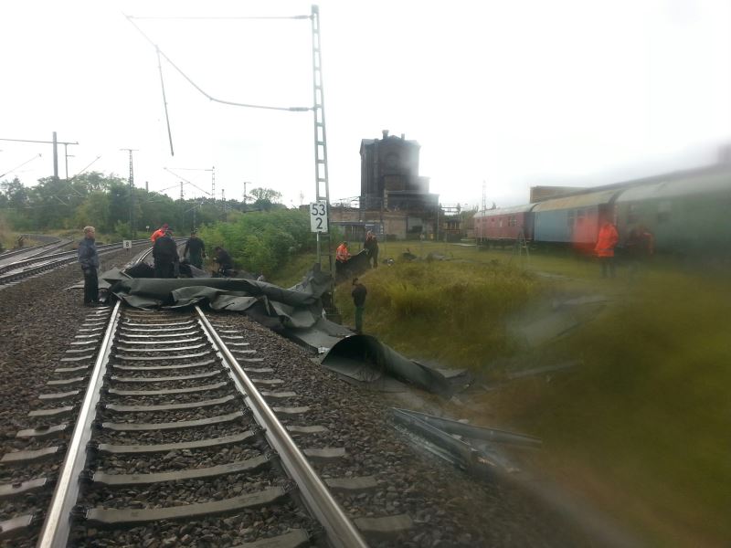 Das Sturmtief Xavier traf den Historischen Lokschuppen Wittenberge hart. Durch die extremen Windböen löste sich ein gut 400 m2 großes Stück mehrlagiger Dachpappe und segelte auf die Gleise der hinter dem Lokschuppen verlaufende Bahnstrecke Wittenberge - Stendal. Das nach Schätzungen gut zwei Tonnen schwere Geschoss beschädigte dabei die Oberleitung und verbog einen Fahrleitungsmast. Nach Sicherung der Unglücksstelle durch das Notfallmanagement der Deutschen Bahn haben zehn Aktive am Freitag nach dem Sturm in einer rund vierstündigen Aktion die Dachpappe in tragbare Stücke geschnitten und vom Gleiskörper abtransportiert. Das Dach des Lokschuppens ist nun zwar beschädigt aber an den kommenden beiden Wochenenden kann das Museum aber noch uneingeschränkt besucht werden, bevor das Dach in der dann einsetzenden Winterpause repariert wird.