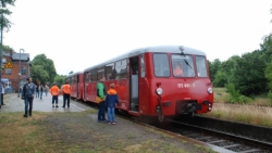 Aber nicht alle bleiben Schaulustige. Gleich am Eingang wartet eine Handhebeldraisine von 1910. Die erste Hälfte ihrer Tour wird im Schlepp eines Schienen-Trabbis von 1965 absolviert, der Rückweg per Muskelkraft zurückgelegt. „Das ist weniger anstrengend, als es aussieht“, meint Vereinsmitglied Guido Huwe, der am Sonnabend als Conductor fungiert. „15 Stundenkilometer schaffen wir hier heute. Tempo 30 ist möglich. Und wir sind schon 72 Kilometer an einem Tag gefahren.“ Dennoch nimmt der eine oder andere lieber im Schienenauto Platz.