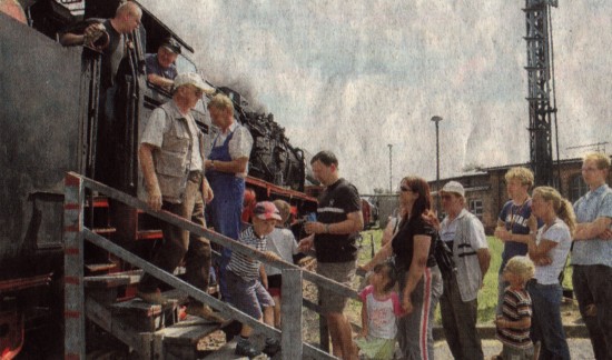 Salzwedel Es dampfte und zischte, stampfte und pfiff. Kleine Kinder machten große Augen - und große Männer irgendwie auch. Der alte Traum, Lokführer zu werden, stand so manch einem ins Gesicht geschrieben. Die Dampflokfreunde hatten für ihre Gäste die liebevoll "schwarze Lady" genannte Lok 503682, Baujahr 1939, bereitgestellt - und die alte Dame fuhr dann auch gemächlich zwischen Lokschuppen und Bahnhof hin und her, das Führerhaus voll mit Kindern und Erwachsenen, die trotz der Hitze in der kohlebefeuerten Lok fröhliche Gesichter machten. Lokführer Ulrich Winterberg fuhr das Ungetüm, Heizer Karsten Lanzke hielt es unter Dampf. Auch eine zweite Dampflok kam zum Einsatz: Ein rumänisches Exemplar aus den 1940er Jahren.